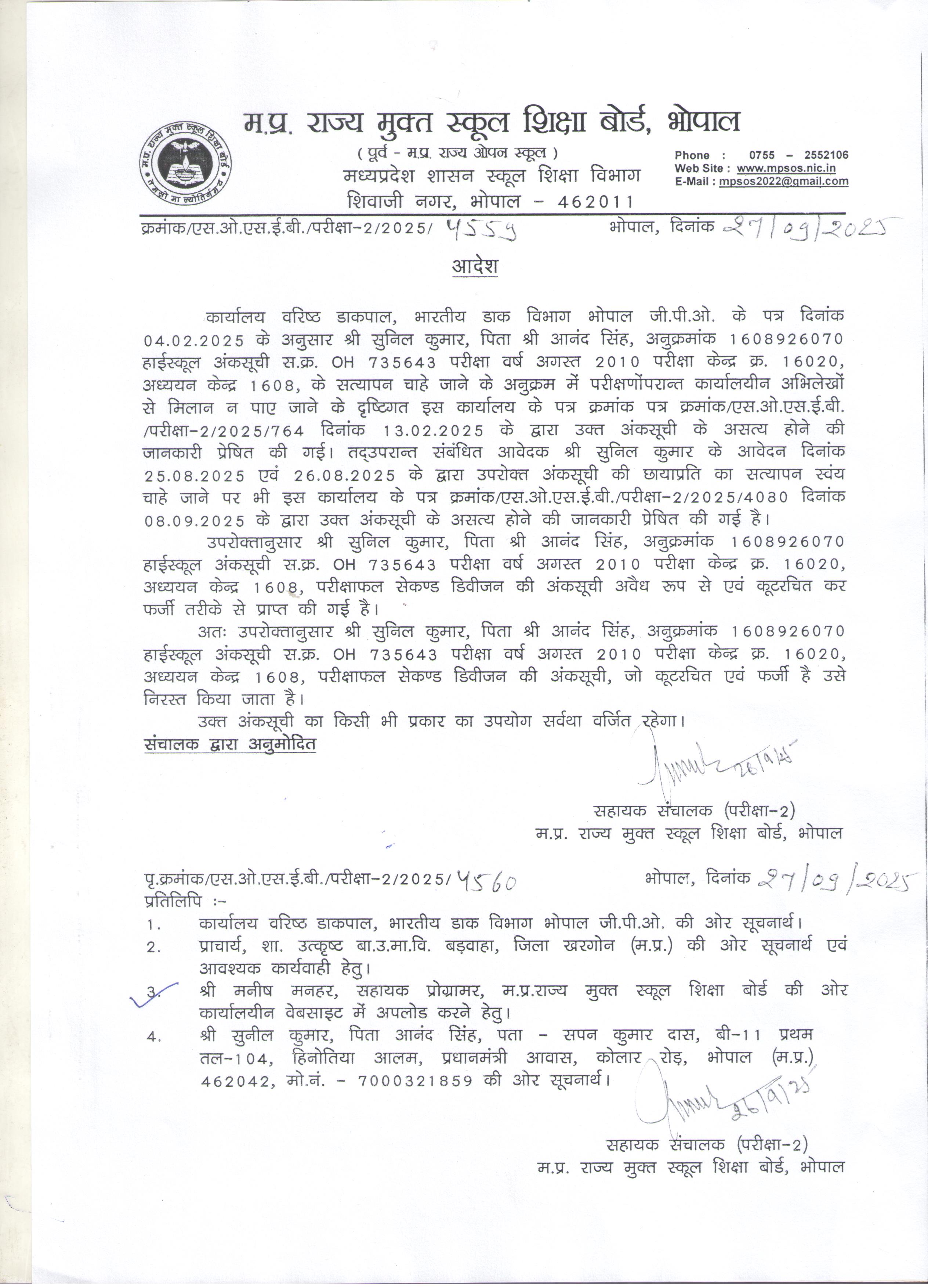 श्री सुनील कुमार पिता श्री आनंद सिंह, ओपन स्कूल परीक्षा अगस्त 2010 रोलनम्बर 1608926070 की अंकसूची निरस्त करने संबंधी आदेश